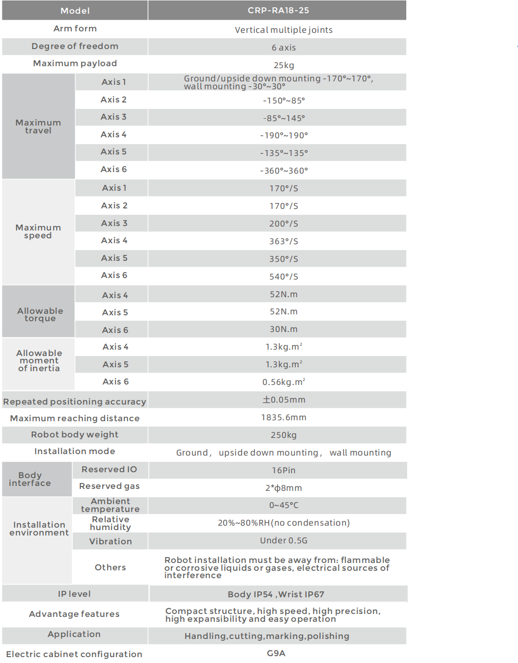 • The design of the robot is highly compact, which is more light weight, especially the wrist is slender, so it can be applied in more scenarios.